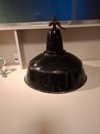Authentieke industriële hanglamp. Zwarte buitenkant, witte binnenkant. Gebruikt, met karakteristieke gebruikssporen. Perfect voor