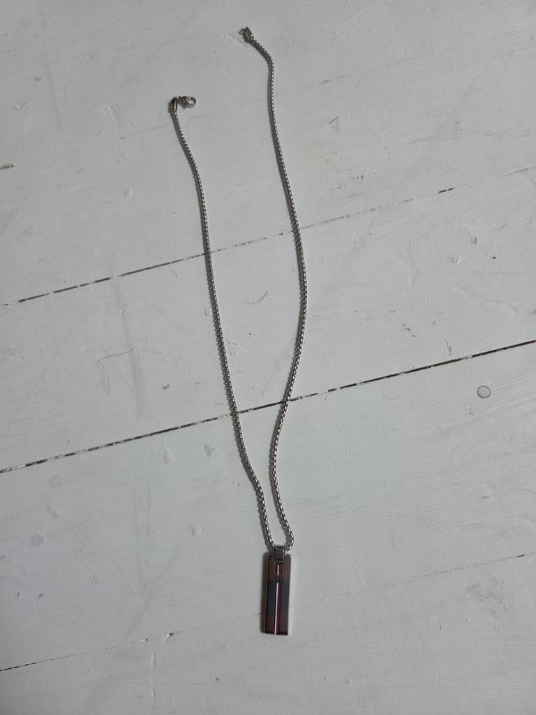 Stijlvolle tommy hilfiger ketting met een zilverkleurige hanger. De hanger heeft het iconische tommy hilfiger logo en de kenmerkende rood-wit-blauwe strepen. De ketting is in goede staat en een perfec