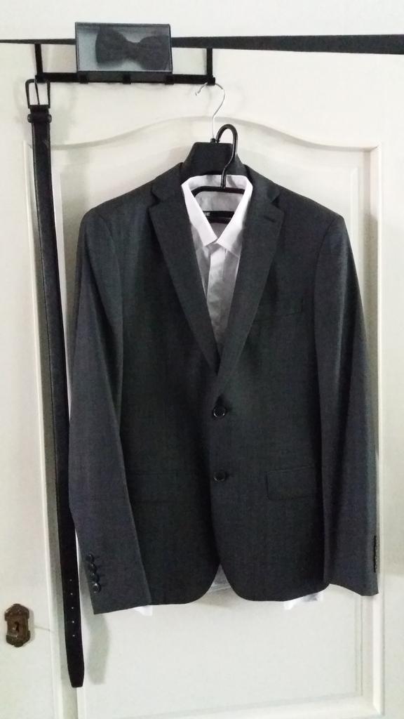 Donker grijs pak / gala pak we fashion mt 44 utra slim fit met 1 blouse wit mt xs en 1 blouse zwart mt xs, een zwarte riem en strik slechts 4 uur gedragen tijdens gala feest op te halen in nijkerk