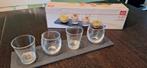 Elke set heeft 4 glaasje van circa 7 cm hoog met een leisteen onderzetter. Ik heb 6 van deze sets. 3 Euro per set of alle 6 voor 1