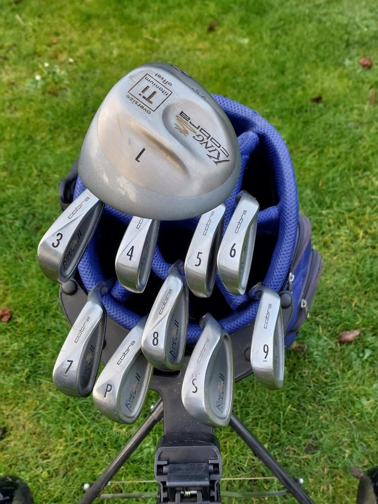 Volledige set van 9 ijzers: 3 t/m s, driver en houten 3 van het gerenommeerde merk cobra. Inclusief houten 5 st. George en mallet-putter odyssey. Opties: in plaats van de st. George houten 5, kun je oGebruikt Ophalen of Verzenden