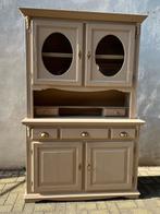 Leuke buffetkast met vele laatjes, opbergruimte en een leuk detail zijn de ovale raampjess in de deurtjes. Uit 2 delen. Taupe kleur onder 132x49x90 cm hoog en het bovenste deel 134x40x126 cm h