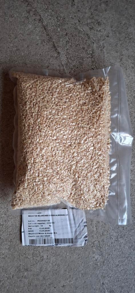 Amandelstukjes. Tht 13-05-2028 per kilo gevacumeerd. 6.5 Kilo beschikbaar. Eventueel ook in kleinere porties beschikbaar.