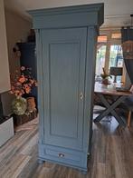 Charmante blauw geverfde ééndeurskast met een lade onderin. De kast is voorzien van een deur en biedt zowel hangruimte als een plank. Ideaal voor spullen in op te bergen.. De kast is in gebruikte staa