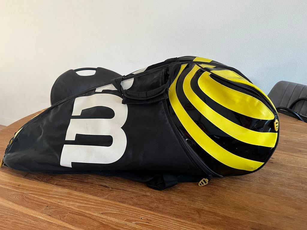 Een mooie tas voor maar liefst 6 rackets. Tas heeft 3 grote vakken en allerlei zijvakken. Tas kun je ook als rugtas dragen. Graag een serieus bod voor deze mooie tas.