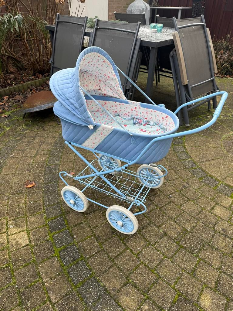 Charmante vintage poppenwagen in blauwe kleur. Ideaal voor poppenmoeders en verzamelaars. De wandelwagen is in goede staat en klaar voor uren speelplezier. Eenvoudig in te klappen.