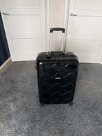 Deze zwarte koffer heeft een patroon aan de voorkant. De koffer heeft wieltjes en een uitschuifbare handgreep. Er zit ook een slot op de koffer. Nooit gebruikt!
