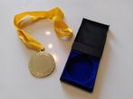 Ijzer met goud kleurige coating met geel lint, fantastisch geschikt als cadeau met gepersonaliseerde sticker erop. Diameter is 7cm