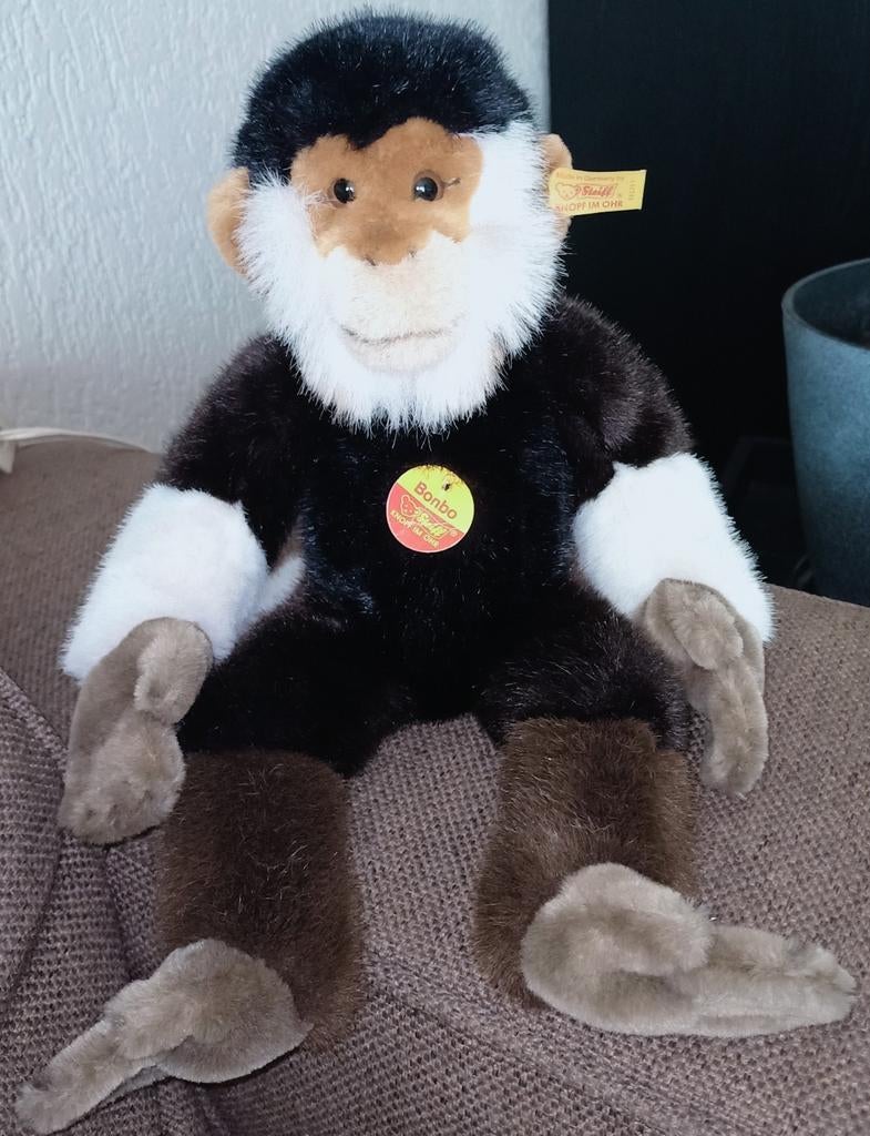 Steiff knopf im ohr bonbo de aap. Bruin zwarte kraalogen. Zwart lijf, bruine oren bovenkant gezicht. Beige snoet. Grijs bruinige handen en voeten. Witte onderarmen en staart. Knoop in oor met geel labZo goed als nieuw Ophalen of Verzenden