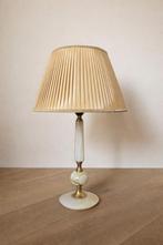 Sfeervolle vintage tafellamp met een elegante voet van onyxsteen gecombineerd met messing details. De geplooide stoffen kap in warme beige tint zorgt voor zacht, diffuus licht en een klassieke uitstra