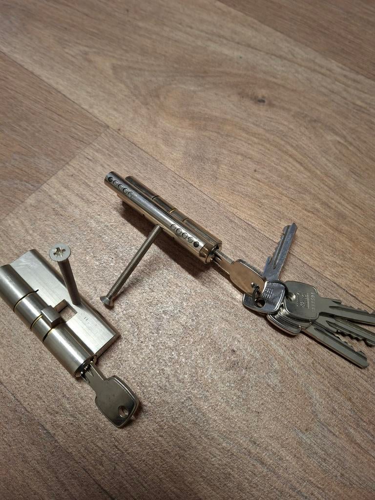 2 gelijksluitende deurcilinders met 6 sleutels ze zijn zgan. Met keurmerk dus voor en achterdeur de zelfde sleutelɓ opha len voor 10 euro of verzenden kosten koper