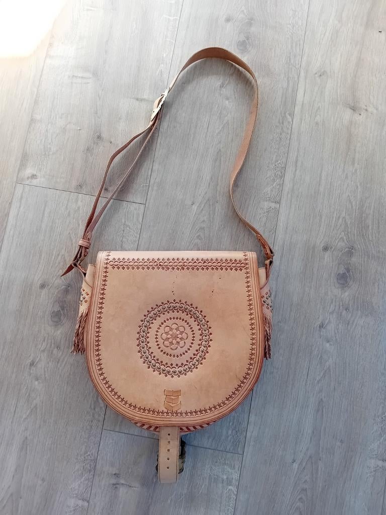 Unieke tuigleren schoudertas ibiza stijl. Afmetingen: 28x 27x 10.