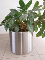 Mooi vormgegeven rvs plantenbak op wieltjes. Cilindrisch: diameter 48 cm, hoogte 41 cm. Met kunststof binnenpot. Rijdt op 4 zwenkw