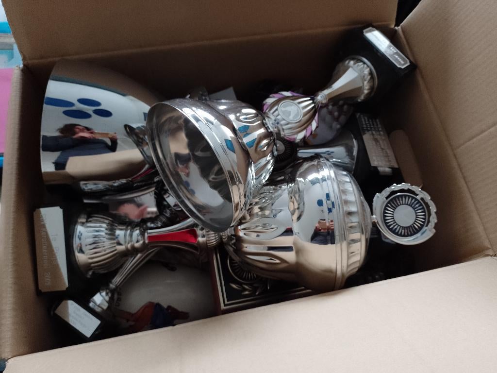 Doos vol tweedehands sportprijzen met (afneembaar) bowling embleem. Moet zsm weg.