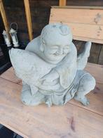 Twee prachtige betonnen boeddha beelden, ideaal voor in de tuin of als decoratie binnenshuis. Het ene beeld toont een lachende boeddha met een vis, het andere een zittende boeddha in meditatiehouding.