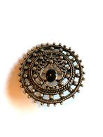 Vintage zilverkleurige broche met zwarte steen. Deze broche heeft een gedetailleerd ontwerp met een zwarte edelsteen in het midden