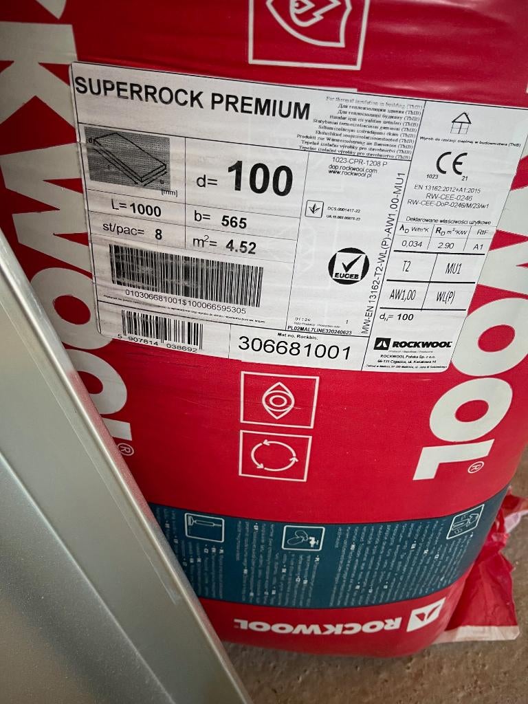 We hebben een houten huis gebouwd en geïsoleerd met rockwool superrock premium 56,5x100x10 cm, er zitten 8 plakken in een pak en dat maakt 4,52 m2 totaal. De rd waarde is 2,9. Wij hebben de binnenmure