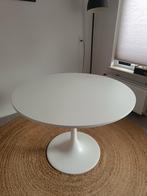 Witte ikea docksta eettafel met een diameter van 103 cm en een hoogte van 75 cm. De tafel is gebruikt en heeft een kleine beschadiging (ca 4mm) maar ziet er verder nog netjes uit.
