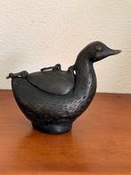 Een antieke eend, van brons. Het is een decoratief item met een deksel op de rug. De eend heeft een donkere patina en is gedetailleerd afgewerkt.bieden vanaf 75 euro
