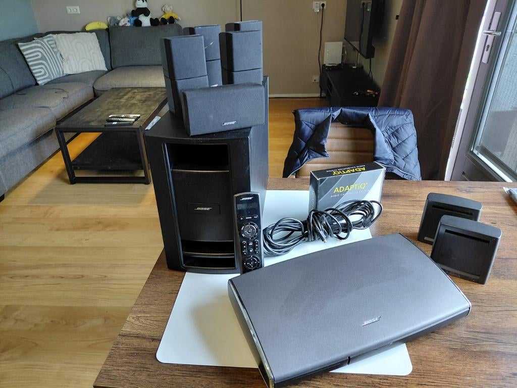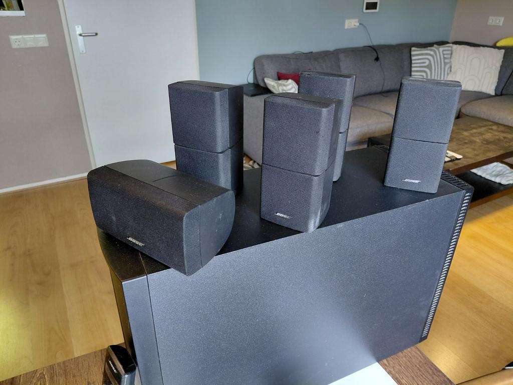 Bose av 35 set volledig compleet werkt perfect wegens overgang naar ander set ook als muziek installatie perfect geluid voorzien van subwoofer 4x satellite 1x center extra set om achter boxen draadloo