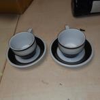 Te koop vintage kop en schotels van royal mosa maastricht, model 016. De kopjes en schotels zijn wit met zwarte rand, wat een klassieke uitstraling geeft. Ze zijn in goede staat en perfect voor de lie