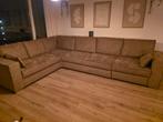 Op maat gemaakte hoekbank met slaapmogelijkheid, geschikt voor 7 personen. De bank is bekleed met een taupe speciale stof die makk