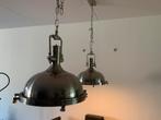 Set van 2 zwaar verchroomde hanglampen in industriële stijl. De lampen hebben een hoogte van 40cm en een doorsnee van 40 cm; in hoogte verstelbaar d.m.v. Metalen ketting. De ophangbalk is 100cm lang e