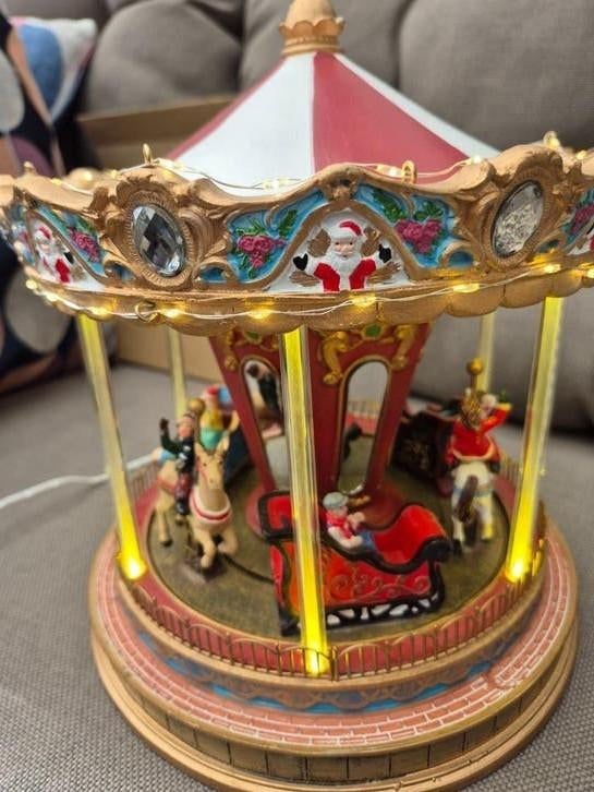 Te koop heel mooie draaimolen met verlichting en muziek die je ook af kan zetten zodat hij draait zonder muziek alles werkt perfect , de verlichting en muziek alleen als hij wat langer stil heeft gestZo goed als nieuw Ophalen of Verzenden