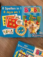 Een verzameling van bumba spellen, inclusief '8 spellen in 1', 'het speelgoedtreintje' en 'memo'. De spell