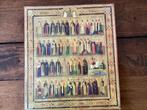 Fotografische afdruk van originele russische maandicoon met de heiligen van de maand april. 20E eeuw. Op 1 april staat de heilige maria van egypte afgebeeld in haar schamele kleding. Zij was een woest