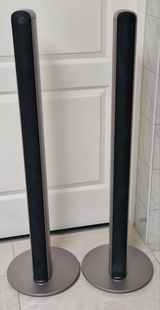Te koop aangeboden: een set elegante, metalen audica cs-t1 luidsprekers. Deze britse luidsprekers, afkomstig van een bedrijf opgericht door audio-veteranen van onder andere mission, staan bekend om hu