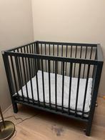 Donkergrijze box. Ongeveer 100x80 cm, twee verschillende hoogtes. Inclusief zachte mat en boxkleed van koeka. Vrij makkelijk te (d