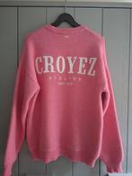 Een roze gebreide trui van croyez. Op de achterkant staat "croyez atelier since 2019". De trui heeft een ronde hals en lange mouwen. Maat s.