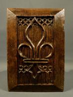 Eiken paneel met " fleur de lis" voorstelling. Afmetingen : 29.5Cm - 19cm. Eind 16e eeuw. Element uit een kist of meubel