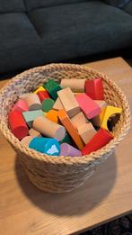 Een mandje vol met diverse houten blokjes in verschillende kleuren en vormen. Leuk speelgoed voor kinderen om mee te bouwen en hun creativiteit te stimuleren. De blokjes zijn in goede staat.Gebruikt Ophalen of Verzenden