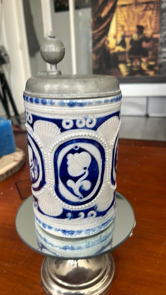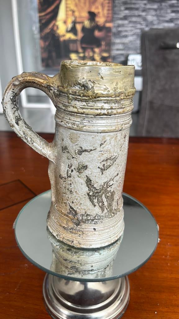 Schnelle, een type hoge, slanke steengoeden drinkkan, vaak gemaakt in het rijnland tijdens de 16e en 17e eeuw. Een stuk van de rand is gerestaureerd verder super leuke kan doe een leuk bod en hij is v