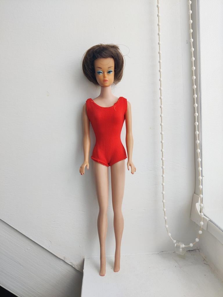 Deze barbie fashion queen draagt een rood badpak en heeft een donkerbruine pruik. De pop is in goede staat gezien de leeftijd. Zie de foto's voor details. Ophalen in nieuwerkerk aan den ijssel of