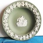 Fraai groen schaaltje van wedgwood, gemaakt in engeland. De rand van het schaaltje is versierd met opgelegde witte bloemmotieven. In het midden staat een vrouw met man en engel, ook in wit opgelegd. D