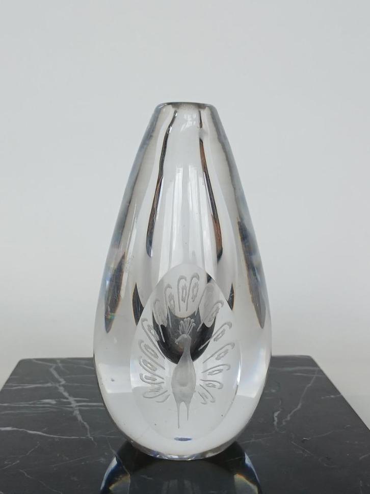 Miniatuur vaas van helder kristal, dikwandig geblazen met massieve bodem. In het vlakgeslepen facet is een elegante pauw geslepen. Het ontwerp uit de 1950’s is van Vicke Lindstrand (1904-1983), een van de pioniers van het Zweedse kunstglas. Onder de voet gegraveerd: Kosta LG 417. Afmetingen: hoogte 12cm, diameter 6cm. Fors gewicht: 699 gram. Minimale gebruikssporen, de vaas is in uitstekende staat. Scandinavisch design van de bovenste plank!