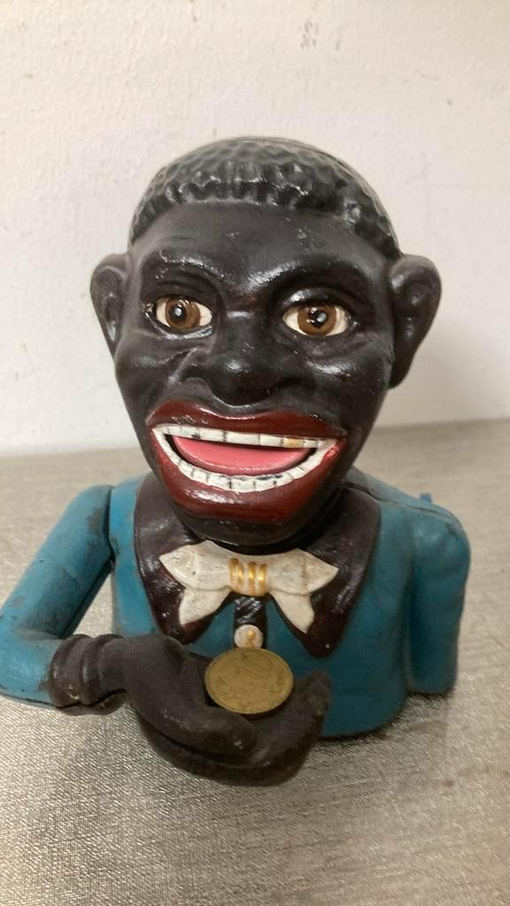 Een antieke gietijzeren spaarpot. Het betreft een spaarpot in de vorm van een man met een blauw jasje en een vlinderdas. De spaarpot is in goede staat, gezien de leeftijd. Een leuk verzamelobject of decoratie.