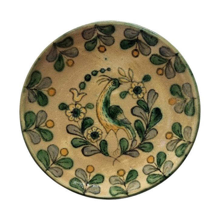 Vintage wandbord met vogel, handgemaakt op het eiland Mallorca in de jaren 70. Dit decoratieve keramieken bord is voorzien van een prachtige handgeschilderde vogel, omringd door bloemmotieven in zachte groentinten.
