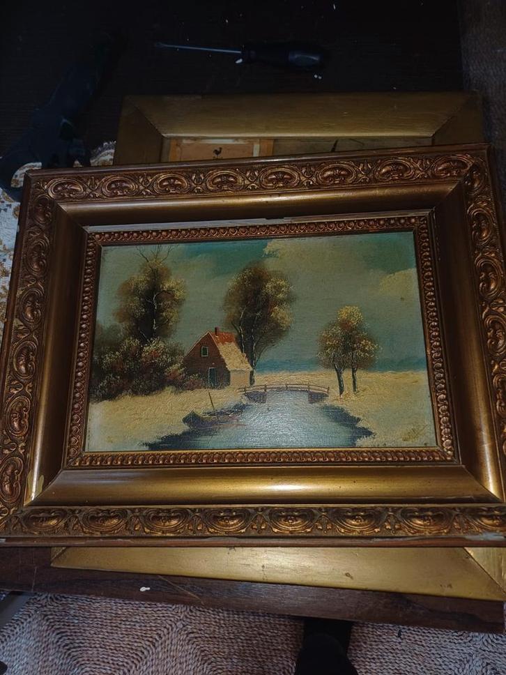 Oud schilderij met een winterlandschap. Het schilderij is ingelijst in een sierlijke gouden lijst. Het stelt een huisje aan het water voor, omgeven door bomen in een winterse omgeving. De staat is goed, gezien de leeftijd.