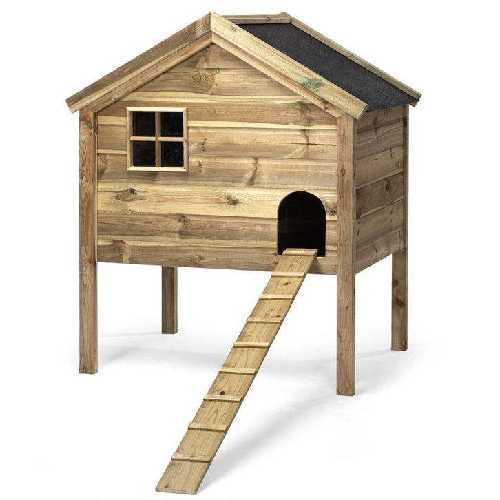 Dit verhoogde kippen nachthok biedt comfort voor de nachten op stok. Beschikt over een spits dakje voorzien van dakleer, een plexiglas ruitje, een groot luik voor de schoonmaak én een trapje voor jouw kippen. De verhoogde poten bieden meer comfort en houden kou tegen op stok.