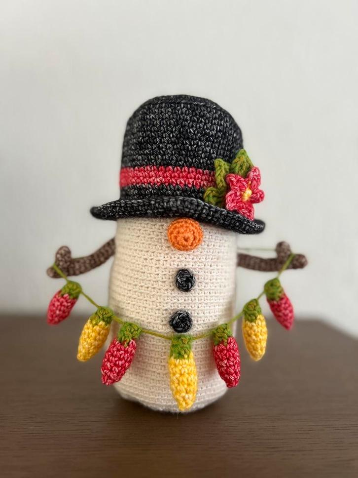Schattige, handgemaakte gehaakte sneeuwpop met een leuke hoed en slingers. Perfecte decoratie voor de feestdagen of een uniek cadeau! Met veel liefde en aandacht voor detail gemaakt. De sneeuwpop is ongeveer 20 cm hoog.