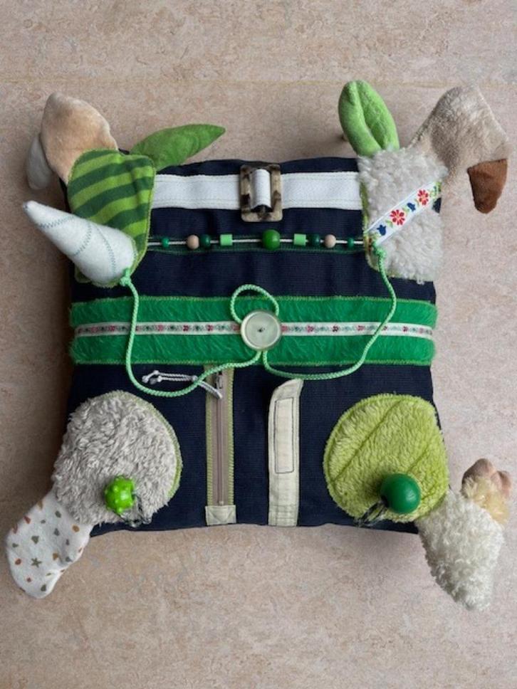 . De activiteiten zoals kunststof of houten ring, grote kraal, geluidjes (2x), knisperfolie en granulaatkorrels (2x) worden verwerkt in de figuren aan de rand van het kussen.