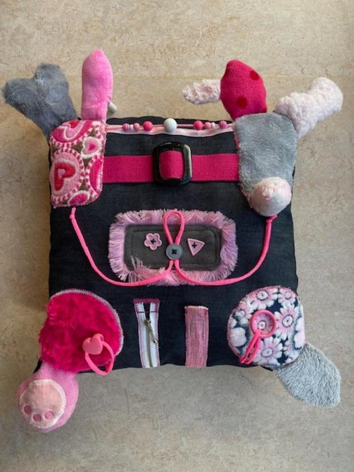 . De activiteiten zoals kunststof of houten ring, grote kraal, geluidjes (2x), knisperfolie en granulaatkorrels (2x) worden verwerkt in de figuren aan de rand van het kussen.