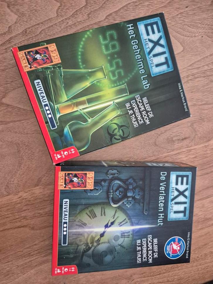 Twee spannende Exit escape room spellen voor thuis: Het Geheime Lab en De Verlaten Hut. Beleef de escape room ervaring in je eigen woonkamer! Beide spellen zijn compleet en in goede staat. Kan zijn dat er onderdelen geprint moeten worden, dat staat dan aangegeven.