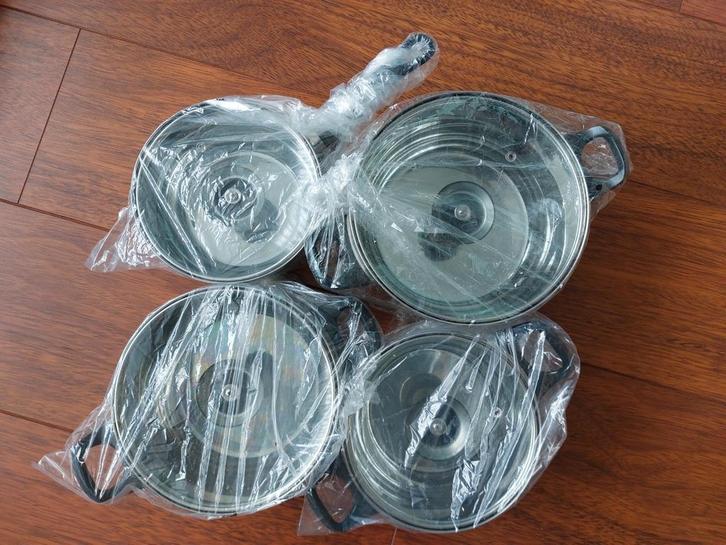 Te koop vanwege dubbbele uitzet. Deze pannen zijn daardoor niet nodig. Allevier de pannen zijn met deksel. 1 pannetje is eenmalig gebruikt.