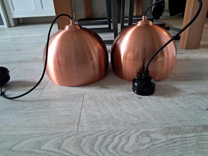 Set van twee stijlvolle koperkleurige hanglampen. Geeft een warme en moderne uitstraling aan elke ruimte. Perfect voor boven een eettafel of in de woonkamer. Conditie is zo goed als nieuw.