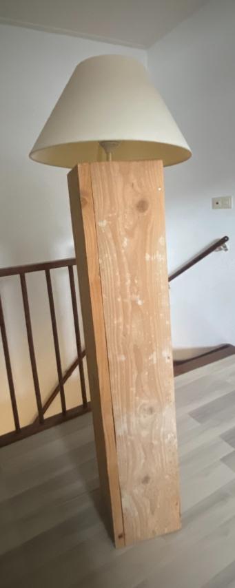 Mooie houten staande lamp, zonder lampenkap. Foto met lampenkap ter illustratie.